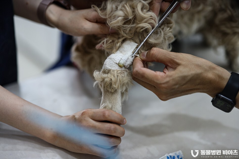어제 응급치료를 받은 흔적을 걷어 냅니다.