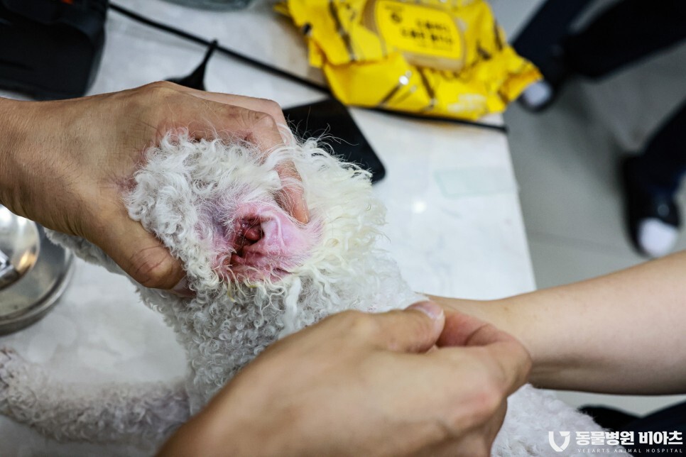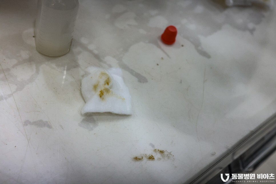 그리고 귀 세척 및 연고 도포를 해줍니다.
