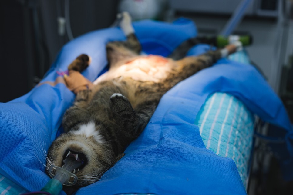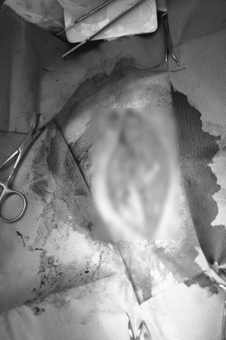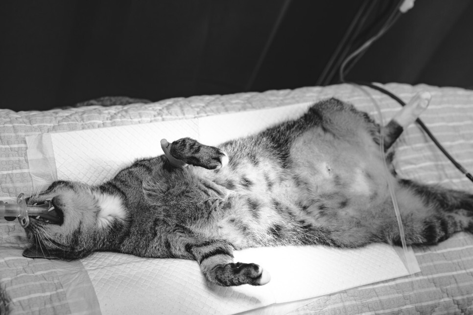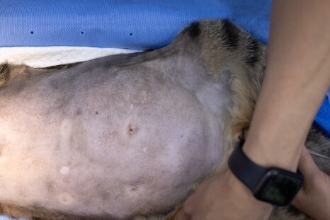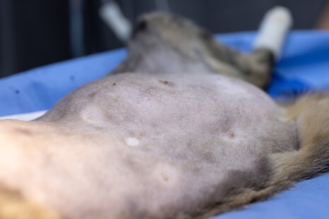 수술을 위해 배 부위의 털을 정리하고 나니 더욱더 확연하게 드러난 볼록 솟은 배입니다.