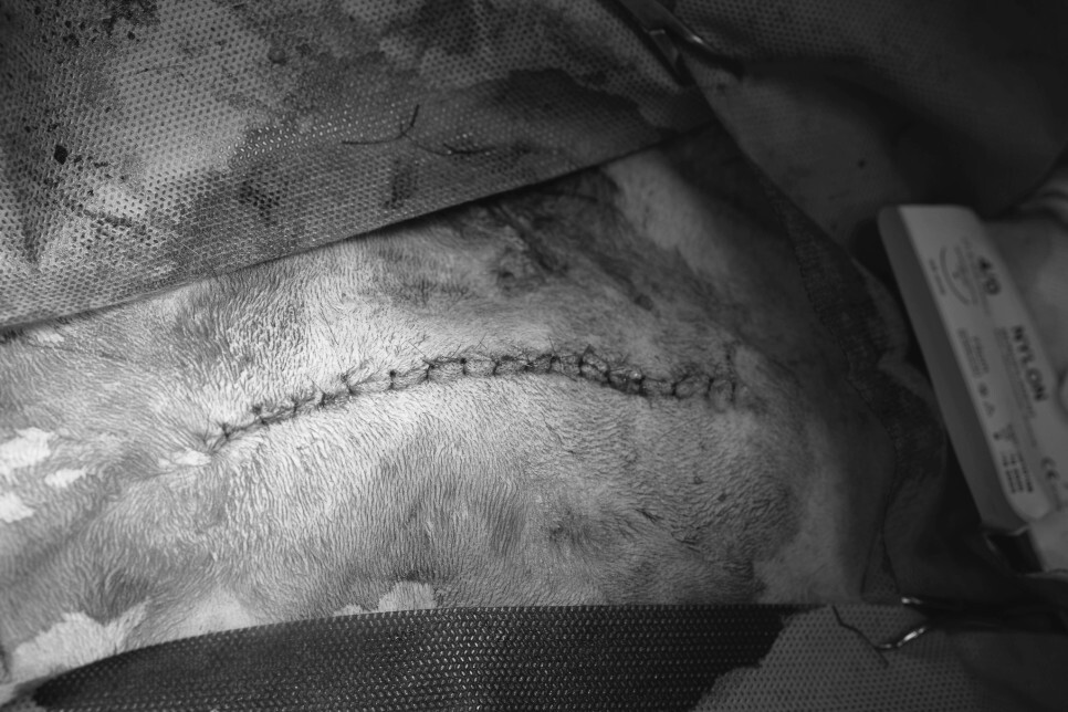 탈장 부위를 제대로 교정한 후 봉합에 들어갑니다.