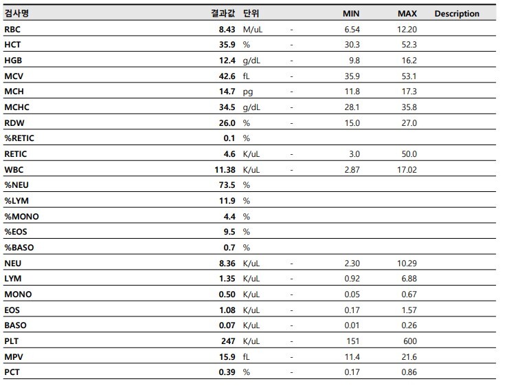 혈액 검사상 특이 소견은 없었습니다.