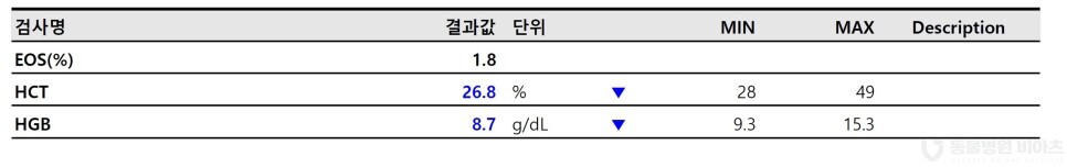적혈구 증가증과 빈혈 정도를 파악할 수 있습니다.